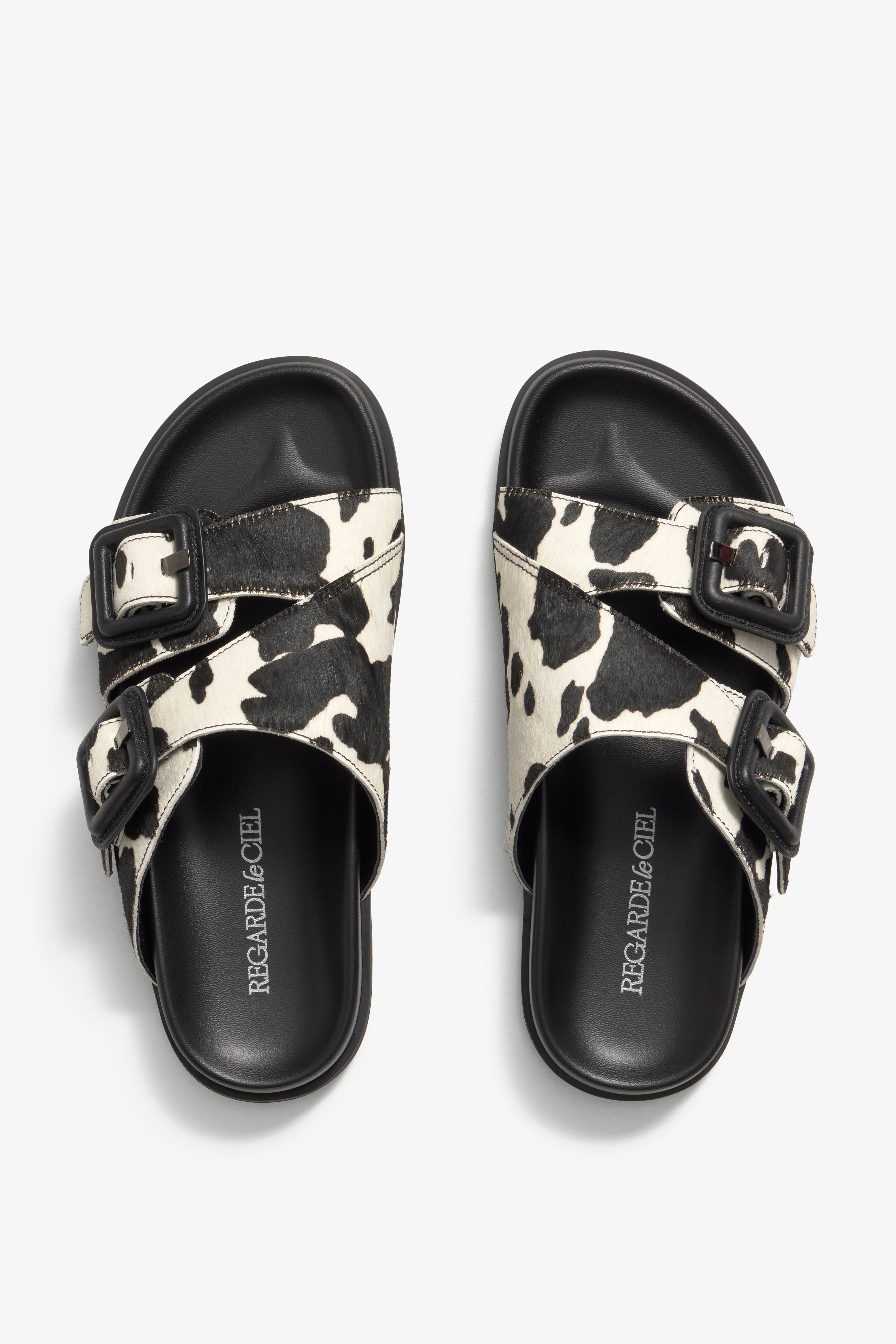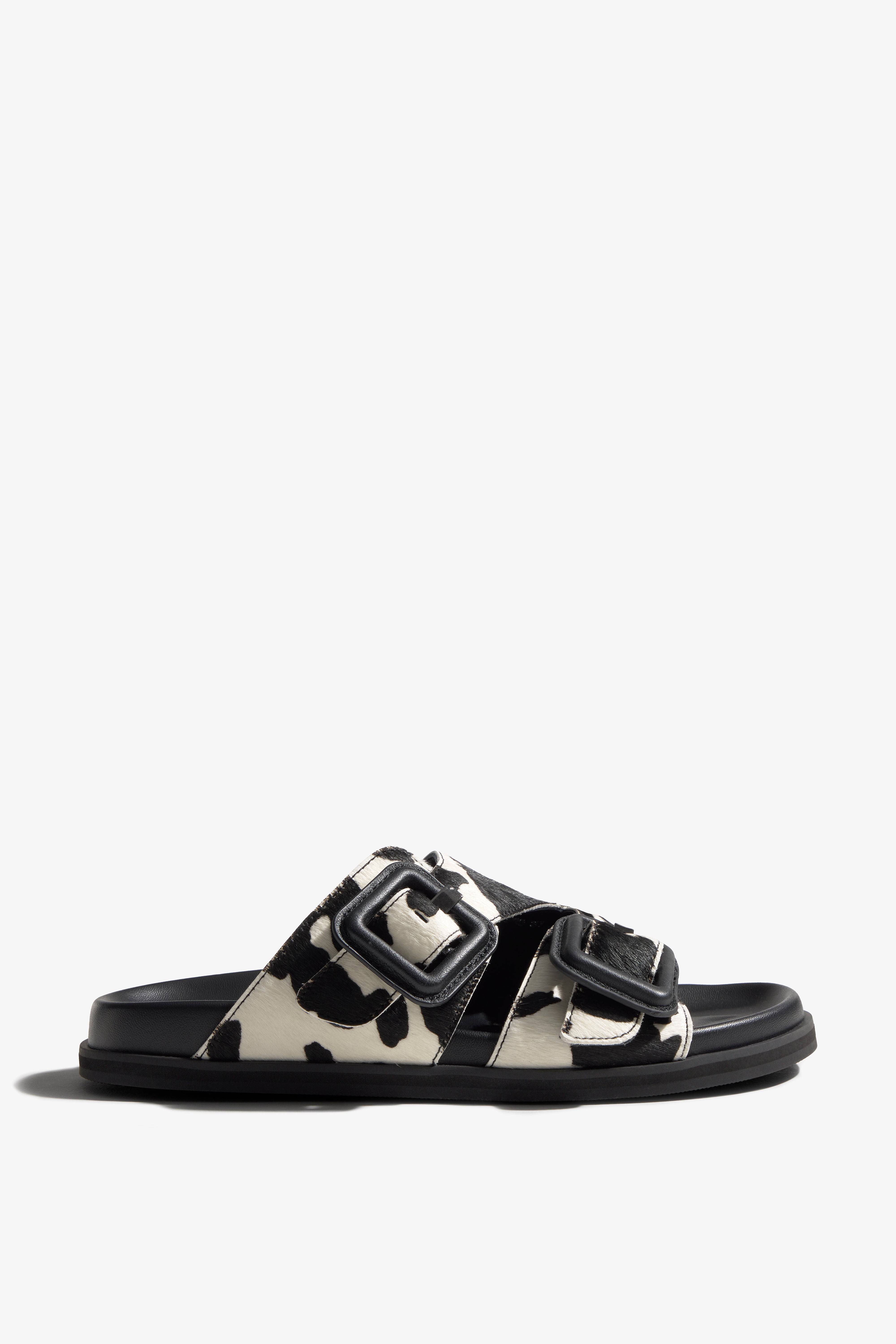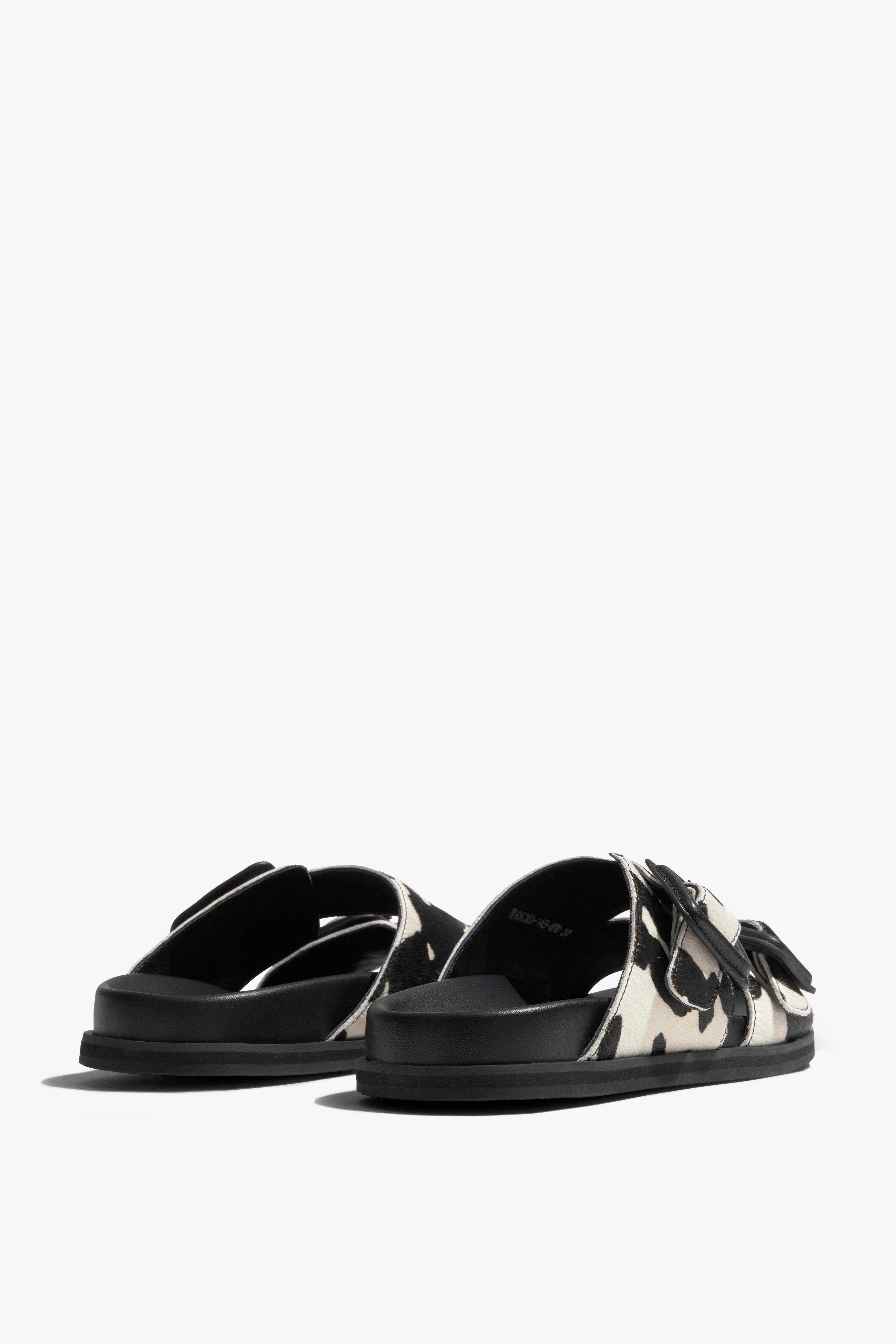 A modern slide sandal crafted from Cowprint leather in black and white, showcasing a harmonious blend of chic style, comfort, and elegance. The design features two adjustable straps with bold buckles for a customizable fit. Prioritizing elevated comfort, it is built upon a lightweight, contoured footbed and a substantial sole. This sandal is intentionally designed as an everyday statement piece that grounds any ensemble with assured sophistication.