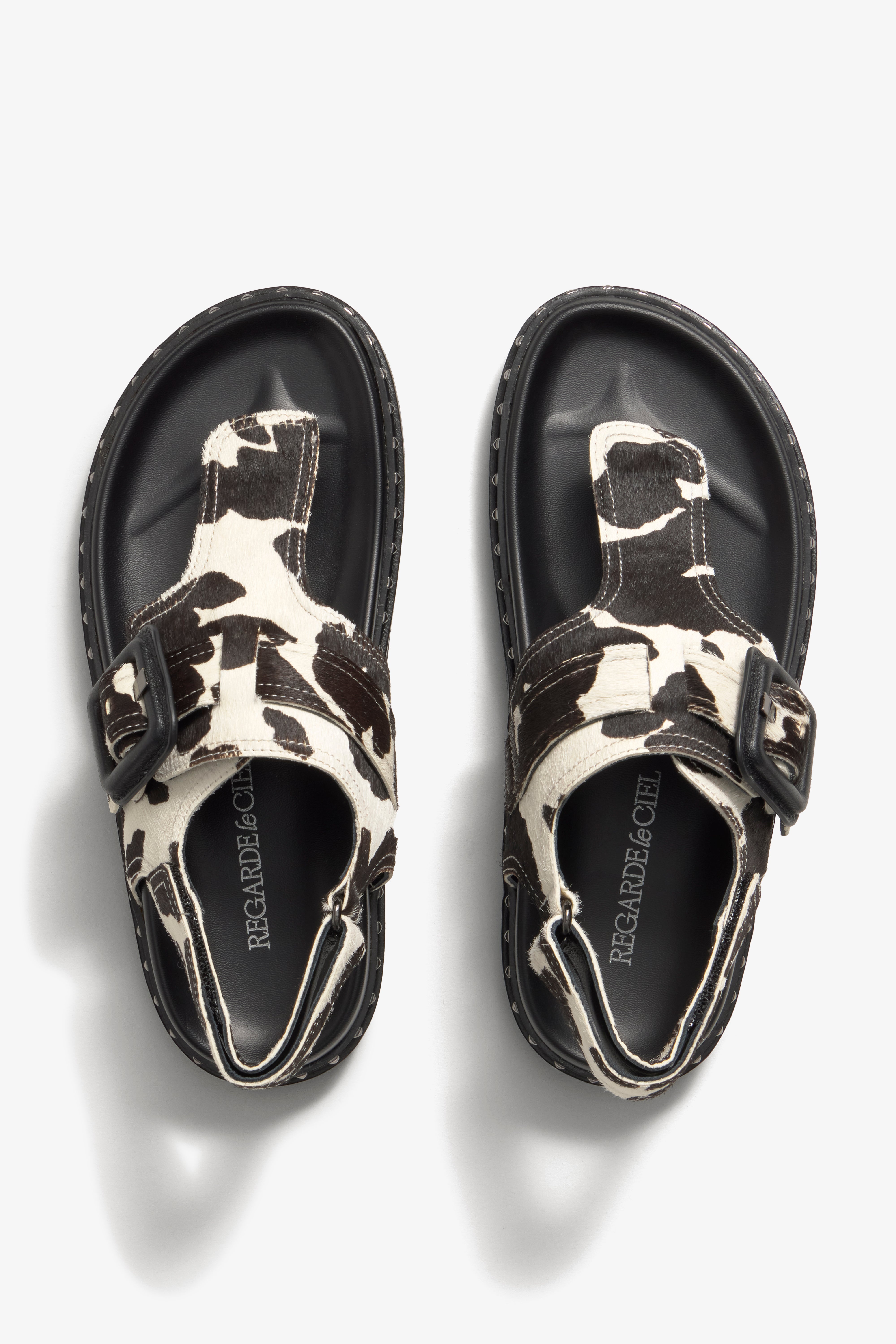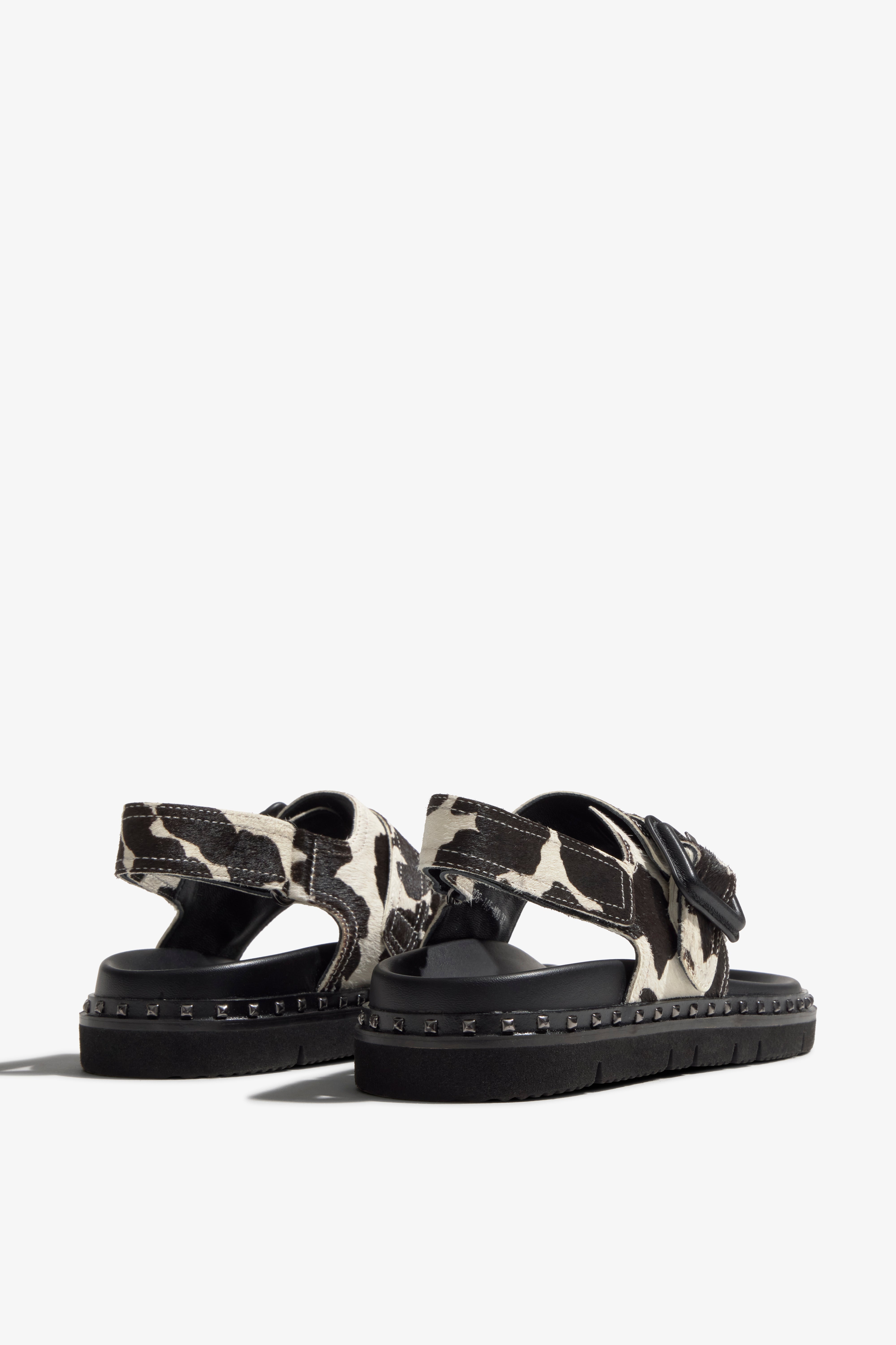 Details: Flat sandal with cowprint leather upper, buckle accent, and metallic elements integrated into the sole .